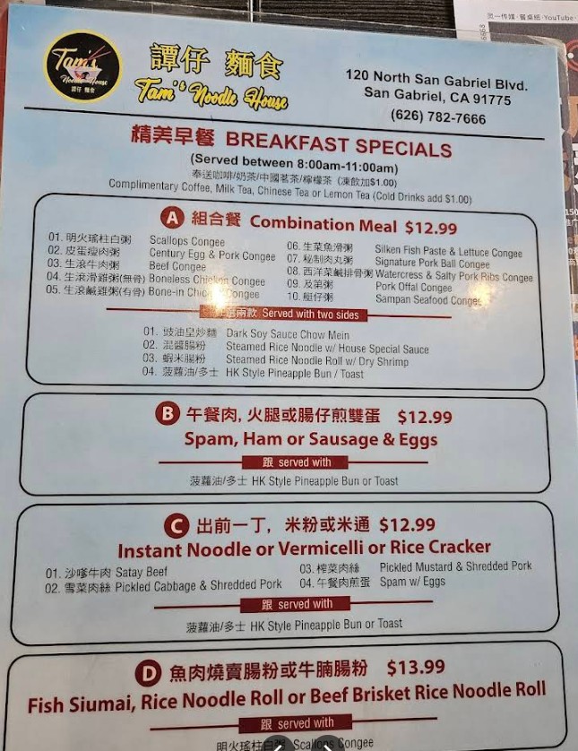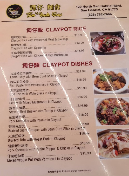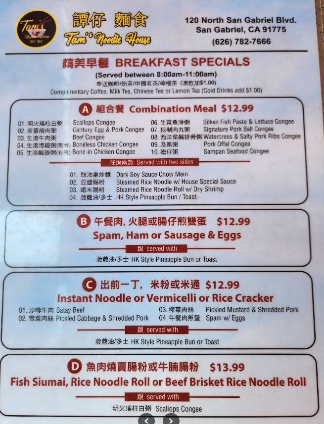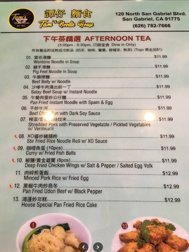 Welcome to Tam’s Noodle House, a local favorite in San Gabriel, CA, known for serving authentic Cantonese noodles, flavorful soups, and classic Chinese dishes made with fresh and traditional ingredients. Our Tam’s Noodle House Restaurant Menu offers a wide selection of comforting noodle bowls, fried rice, stir-fried specialties, dim sum favorites, and signature house plates prepared with rich flavors and homemade sauces. Whether you’re stopping in for a quick meal or ordering for the family, we bring you the perfect blend of taste, quality, and tradition. Browse our full menu and discover why Tam’s Noodle House remains a trusted choice for delicious Cantonese cuisine.